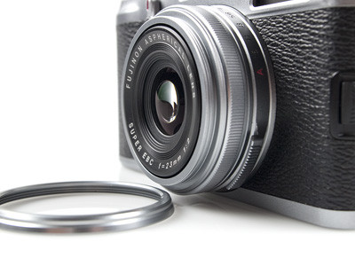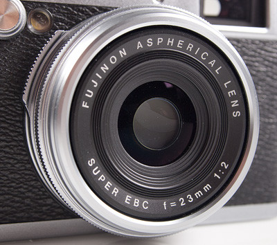 A FujiFilm X100 optikája nem cserélhető, hanem fix 23 mm (ekv. 35 mm) gyújtótávolságú. A gyártó elmondása szerint azért döntöttek emellett a megoldás mellett, mert így egyrészt érzékelő és optika teljes mértékben egymásra lehet hangolva, a szenzor nem koszolódik objektív cseréjekor, és nem utolsósorban a hibrid kereső is csak így volt megvalósítható. A lencserendszer rekeszértékét az azt körbeölelő tárcsa segítségével állíthatjuk F2.0 és F16 között teljes FÉ értékenként. Ha kisebb mértékben (1/3 FÉ) szeretnénk csökkenteni vagy növelni a fényáteresztést, akkor azt a masina hátoldalán látható kis billenőkapcsolóval tehetjük meg (hüvelykujj mellett, jobb felső sarok), vagy záridő-prioritásos módba állítva a gépet úgy, hogy a rekeszgyűrűt „A” állásba tekerjük.