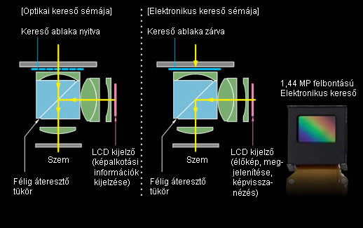 A másik módja a keresőnek immár teljesen elektronikus és TTL képet adó. A kereső módjai között a fényképezőgép előlapján található kis kar működtetésével válthatunk: