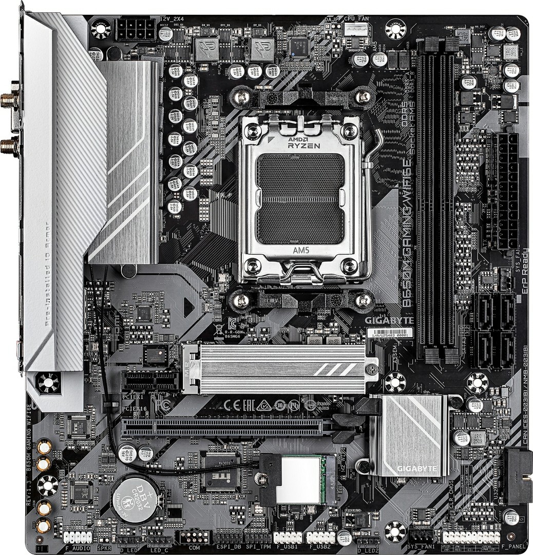 Ha csupán egy nem túl drága, AMD Socket AM5-ös alaplapot szeretnénk, érdemes lehet elgondolkodnunk a Gigabyte 3 éves garanciával 46 220 forintot kóstáló modelljén, a B650M Gaming WiFi6E-n. A microATX kivitelű, AMD B650 vezérlőhidat használó megoldásba 7000-es, 8000-es vagy 9000-es sorozatú AMD Ryzen processzort passzinthatunk, és két DIMM foglalata legfeljebb 128 GB, tuninggal 7600 MT/s-os sebességre hangolt DDR5 memóriát tud kezelni. A bővítőkártyákat egy x16-os PCI Express 4.0 és egy x1-es PCI Express 3.0 sín várja, és a PCI Express 4.0-s M.2 2280/2580 slothoz alumíniumbordázat jár, csakúgy, mint az 5+2+2 fázisos VRM-hez.