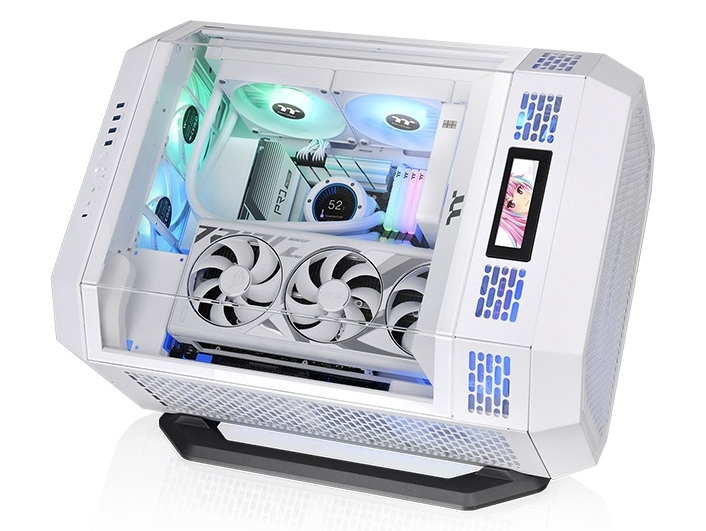 Fehér Thermaltake The Tower 600 az opcionális kitámasztó készlettel, riser kábellel és LCD kijelzővel [+]