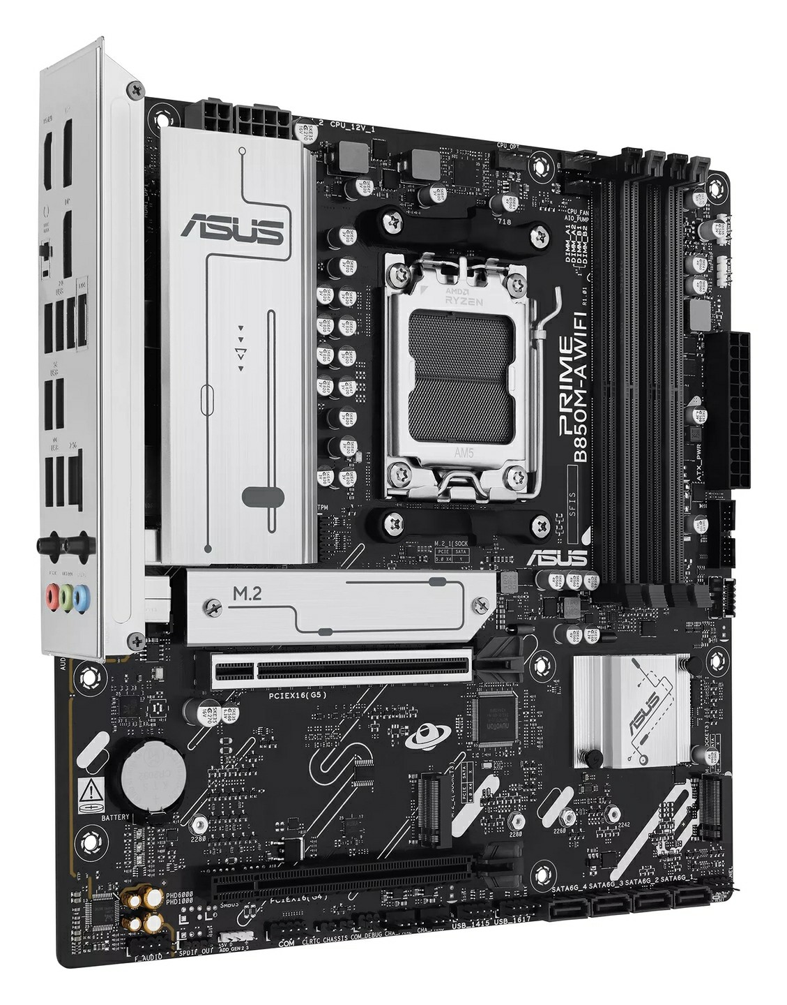 A Wi-Fi 6E/Bluetooth 5.3 egységgel bíró, AMD B850 vezérlőhídra épülő modell nyolccsatornás Realtek hangkodekjét prémium audiokondenzátorokkal turbózták fel, és a 2,5 Gbps-os Ethernetet is Realtek kontroller hajtja. Fix (rozsdamentes acél) hátlapján egy BIOS FlashBack gomb, két, 1.4-es verziójú DisplayPort, egy 2.1-es HDMI kimenet, két antenna csatoló, három, 3,5 mm-es audio jack, a fentebb említett LAN, valamint két USB 3.2 Gen 2 Type-A, két USB 3.2 Gen 1 Type-A és négy USB 2.0 csatlakozó található. A gépház elejére egy 5 voltos/3 amperes USB 3.2 Gen 1 Type-C, két USB 3.2 Gen 1 Type-A és négy USB 2.0 konnektor vezethető ki. A rendszerhűtő ventilátorokat három PWM tüskesora, az RGB-s eszközöket pedig három ARGB Gen 2 headerre köthetjük rá.