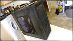 Végül pedig egy modderek körében még ritkán használt felületkezelési módszerrel emelte alkotását új szintre. A vizes transzfernyomtatás (VTN) lényege egy folyadékba helyezett, nagyon vékony fólia, ami tökéletesen illeszkedik a belemerített tárgy felületére. Ennek segítségével az eredetileg mezei, álcázó festéssel díszített grafikus kártya takaróelemeiből valami sokkal látványosabb született. A két NVIDIA GeForce GTX 470 "díszítését" a többi komponens, majd a ház elemei követték.