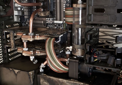 A fóliázás mellett a másik komoly látványelem a vízhűtés réz csövezése, amiből a processzor és a két grafikus kártya kapott, de a ház lemezeit nem kellett radikálisan átszabni.