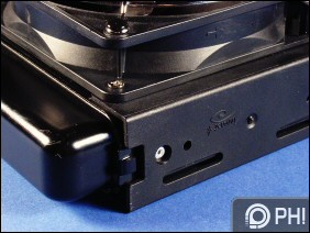 innovaRADI Single néven fut a szett hőleadó radiátora, mely ventilátor nélkül 175 x 140 x 45 mm méretű, és egy darab 120 mm-es légkeverő fogadására képes. Nagyjából 480 gramm tömegű, a ventilátor és maga a radiátor egy műanyag burkolat segítségével rögzíthető, és pont befér egy 5.25"-ös bővítőhelyre. Ventilátorral együtt már két meghajtó helyét kell feláldoznunk, ezért praktikusabb lehet a házon kívűl rögzíteni, ami a rögzítőfuratoknak köszönhetően nem bonyolult, de a házat bizony meg kell fúrni hozzá. Mint a rendszer összes többi eleme, ez is krómozott, 8x1-es tömlőhöz illeszkedő, cserélhető csatlakozókkal rendelkezik.