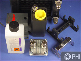 Egy Eheim 1046-os vízpumpa is jár a szetthez, ami óránként 300 liter vizet mozgat meg a 230 Voltos hálózatból nyert 5 Watt segítségével. Egy AGB-O-Matic elnevezésű kiegyenlítőtartály segít a feltöltésben és a buborékmentesítésben. Viszonylag kompakt méretű (50 x 56 x 120 mm), nagyon egyszerűen rögzíthető a pumpához, és egy praktikus, jól tömített töltőnyílást is találhatunk rajta. A pumpán nincs kapcsoló, így a hálózati dugasz az egyetlen lehetőségünk a ki-be kapcsolásra. Ez a mi esetünkben ugyan nem volt zavaró, mert a tesztkonfig minden tagja egy kapcsolós elosztóba volt dugva, de sokkal elegánsabb megoldás lett volna egy megfelelő vezérlőelektronika mellékelése.