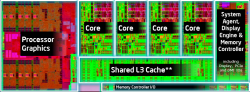 A fenti, négymagos lapkákat ábrázoló képekből megállapíthatjuk, hogy az új lapka alapvető felépítése a Sandy Bridge által lerakott "soros" elrendezést követi. A két dizájnt összehasonlítva láthatjuk, hogy tovább hízott a grafikus szekció, illetve a jobb szélen látható "System Agent" kezdetű terület is megnőtt. Ennek egyik oka, hogy immáron a digitális kijelzők interfésze az alaplapi chipkészletből (PCH) beköltözött a processzorba. Ahogy már utaltunk rá, a gyártástechnológia nem változott, ergo maradt a tavaly debütált 22 nm-es Tri-Gate technológia.