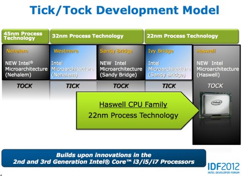 A Intel tick-tock elve szerint új gyártástechnológia bevezetésekor először a már meglévő, aktuális mikroarchitektúrára alkalmazzák azt, mely elsősorban gazdaságosabb gyártást eredményez. Ezen termékvonal felfuttatása elegendő időt biztosít a tervezőcsapatok számára, hogy a csíkszélesség csökkentésével előálló, a gazdaságosan gyártható lapkaméretbe beleférő többlet tranzisztormennyiséget a következő mikroarchitektúrában átgondoltan költsék el.