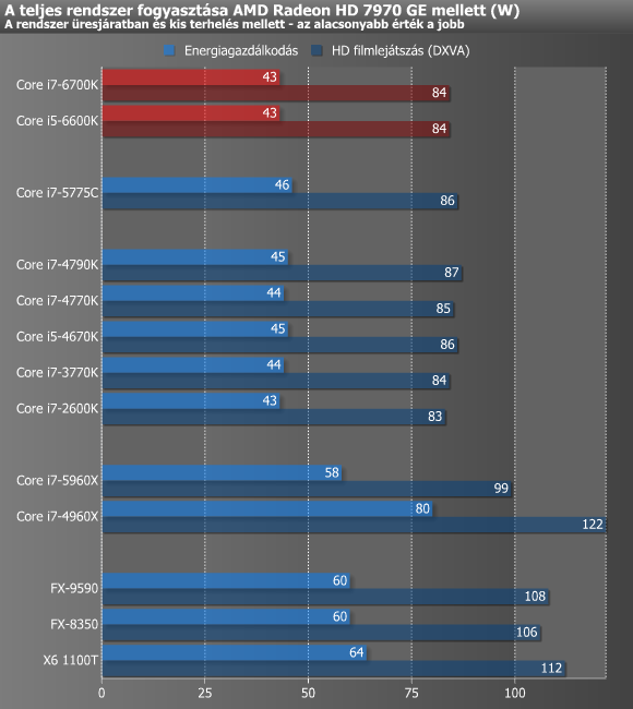 Csupán az integrált grafikus vezérlő mellett már más volt a kép, ugyanis így már jó néhány wattal kevesebbet kért a Skylake, különösen hardveresen gyorsított filmlejátszás mellett.