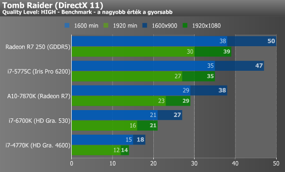 Batman esetében a kisebbik, 1600x900-as felbontásban nagyobbat lépett előre a Skylake, ugyanakkor a Thiefről már nem mondható el ugyanez. Végül Tomb Raider alatt ismét nagyot ugrott a Skylake, ami bizakodásra adhat okot.