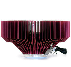 Orb, mert kerek. Méretes lamellasor öleli körbe a szintén elég nagy, 120 mm-es ventilátort. Alul vastagabb profilok indulnak ki sugárszerűen a CPU-val érintkező blokkból, ezek kifelé fokozatosan elágaznak és vékonyodnak. Nem vagyunk róla meggyőződve, hogy ez az elrendezés olyan hatásos lehet, mint a hőcsöves. Ráadásul így nagyobb fémtömeg kell, a Ruby Orb 545 grammos súlyával mai mezőnyünk legnehezebbje.
