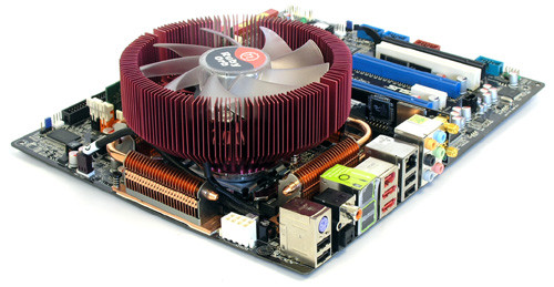 Felszerelve látszott a Ruby Orb leglényegesebb tulajdonsága, hogy meglehetősen alacsony. Csupán 73,3 mm magas, így az alaplapnak és tartóinak durván 10 milliméterével együtt is 90 mm alatt marad, így a laposabb HTPC-kbe is jó lehet. Persze – különösen Mini-ITX alaplapoknál – nagyon figyelni kell a szélességére, ami viszont elég tetemes, 140 mm.