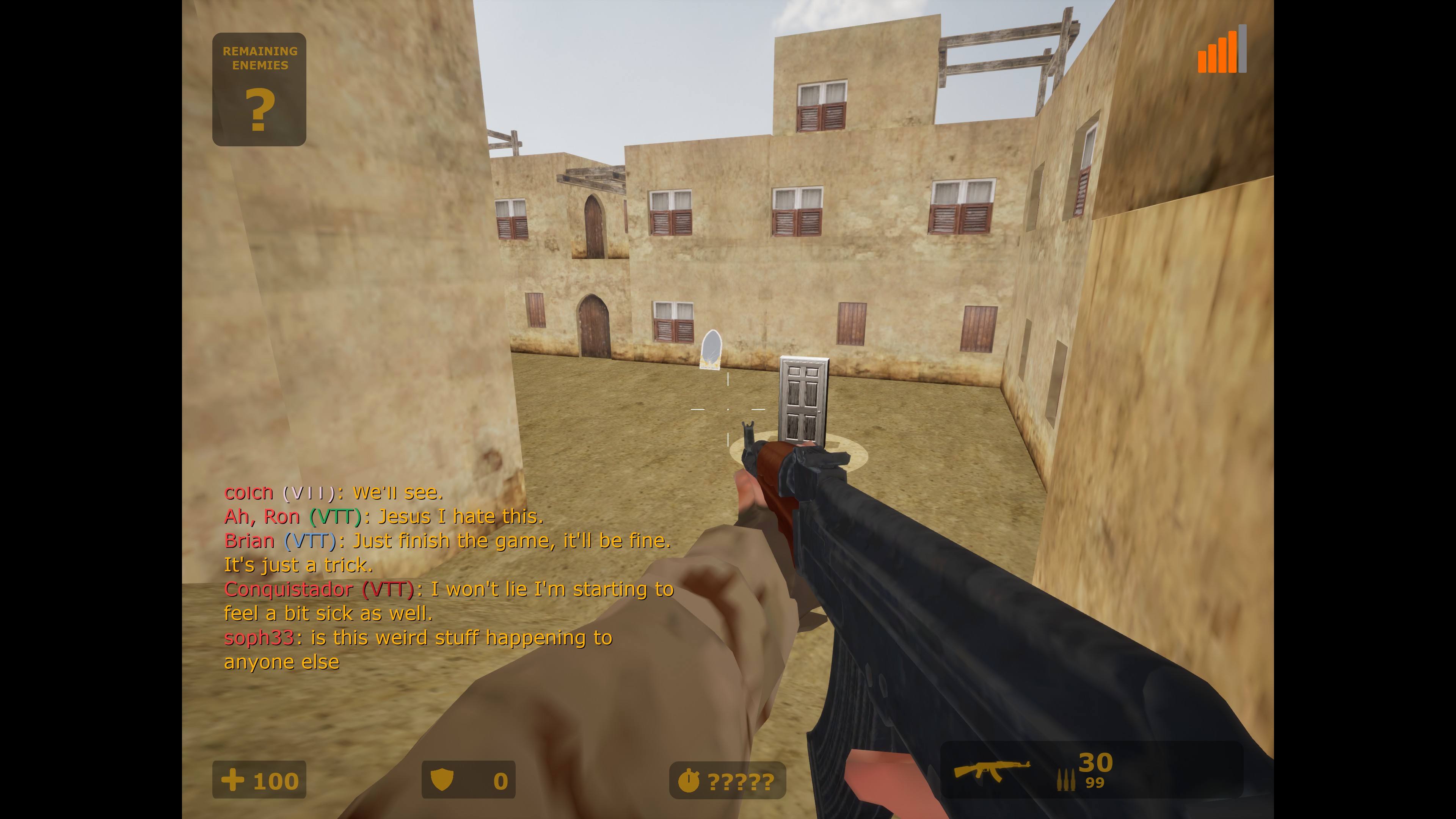 A Doki Doki Literature Club! egy teljesen átlagos, vidáman csajozós visual novel, amiben csinos kiválasztottunknak csapjuk a szelet és még verset is írunk neki – neki, az egyik teljesen kiegyensúlyozott fiatal osztálytásrunknak. A Stanley Parable egyszerűen arról szól, hogy egy irodai dolgozó megpróbálja megkeresni kollégáit, majd amikor nem leli őket, hazaindul. Az It Takes A War egy gagyi Counter-Strike 1.6-utánérzés, amelyben, ha szerencsések vagyunk, az online meccsek során akár egy összeszokott baráti társaság beszélgetésébe is belehallgathatunk. A felszínen ez mindössze egy asset flip FPS-nek látszik, és hát az is; miként is lehetne annál több? Elvégre Thomas Mackinnon előző játéka, a The Corridor is pontosan az volt, aminek tűnt: egy üres folyosó, talán egy gombbal felszerelve – játéknak pedig mindez aligha nevezhető, nem igaz?
