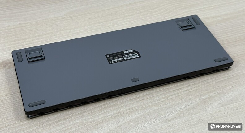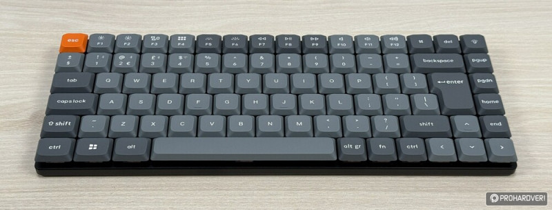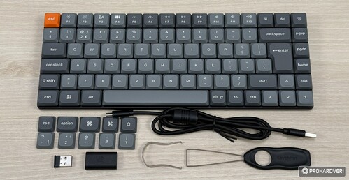 A vezeték nélküli klaviatúra egy szerény méretű dobozban érkezik, amiben egy USB Type-C/Type-A toldóadapter, néhány extra – windowsos használathoz szánt – kupak, egy kupakszedő és egy kapcsolószedő csipesz található magán a periférián, no meg jelszűrő ferritgyönggyel megspékelt USB Type-C/Type-A kábelen kívül. Az UK ISO kiosztású, lebegőgombos apparátus plate-ként funkcionáló fedőlapja alumínium, de készülékházának alsó része ABS műanyag, gyorscserés foglalataiba pedig gyárilag kent, lineáris karakterisztikájú Gateron LP 2.0 Red (50 gf, 3/1,7 mm) vagy enyhén taktilis Gateron LP 2.0 Brown (55 gf, 3/1,7 mm) switch-ek kérhetők – nálunk az előbbi járt.
