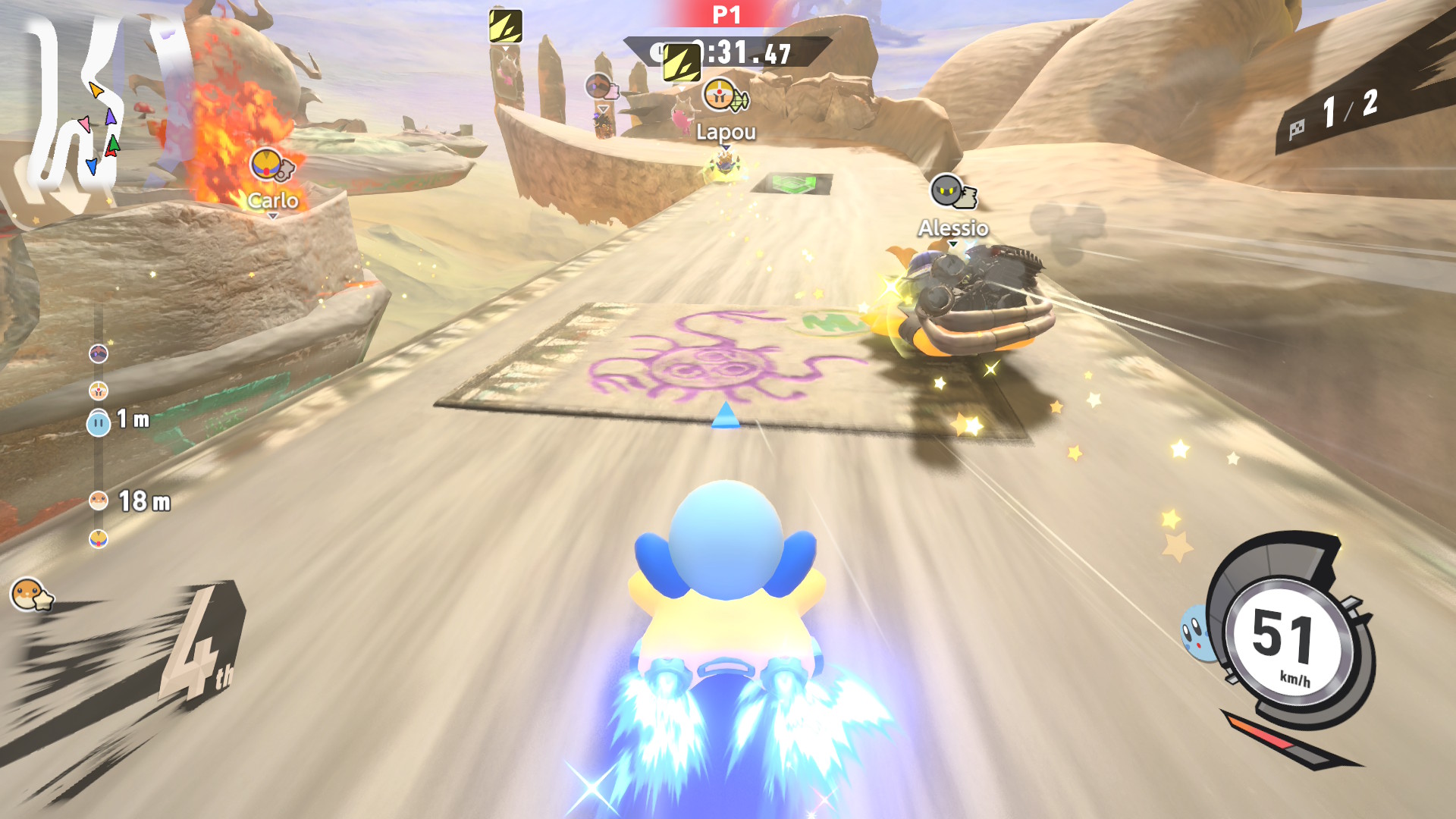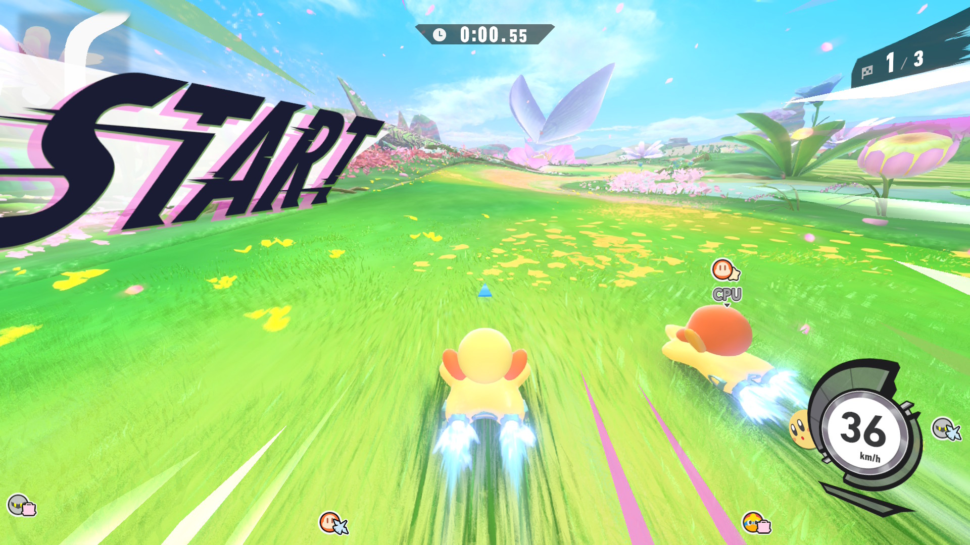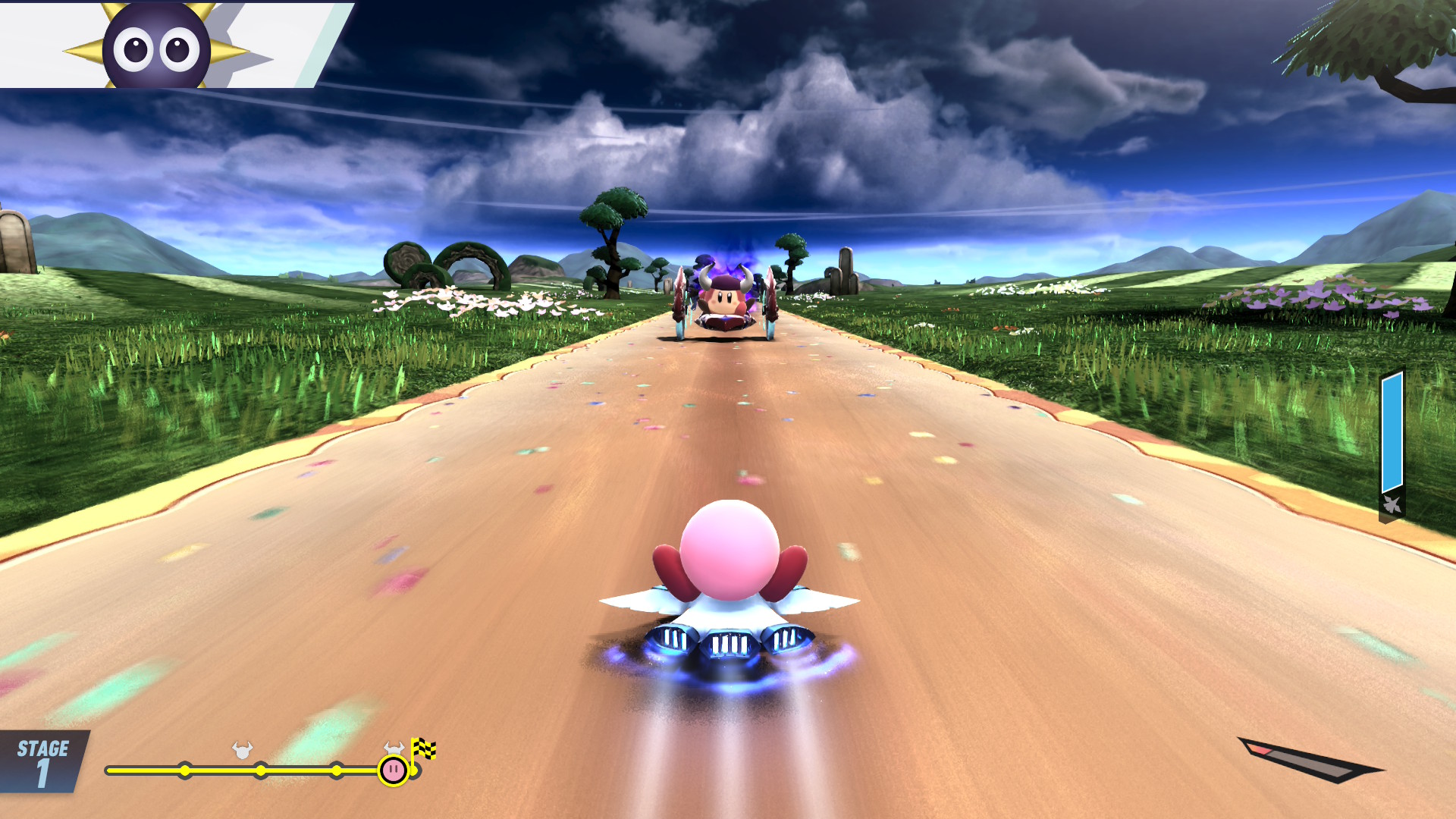 Mindegyik szereplő más-más paraméterekkel bír: van, aki jobban gyorsul; más könnyebben fordul; és van olyan, aki strapabíróbb. Emellett mindenkinek van egy speciális képessége is, amit időszakosan tud bevetni: Kirby például szivárványszín karddal csapkod; Meta Knight szárnyakat öltve süvít előre; míg Lololo és Lalala párosa meg dobozokat hajigálnak, akadályozva a többieket. Ennél még eltérőbb élményt kínálnak a különböző gépek, amik nemcsak alapvető mutatóikban különböznek, de teljesen eltérő vezérlést követelhetnek meg. Van, ami sokkal hatékonyabb repülés közben, arra ösztökélve a játékost, hogy aktívabban használja a rámpákat. Egy másik egyáltalán nem tud boostolni a B lenyomásával, cserébe robosztusabb és gyorsabb. Egy harmadik pedig folyamatosan tart egyenesen, a B lenyomásával pedig teljesen leállítjuk, és ilyenkor változtathatunk irányt: olyan, mintha molnárkaként szökdécselne. Rengeteg lehetőség van, amelyek más-más taktikákat követelnek meg, és roppant élvezetes kipróbálni mindegyiket, és felfedezni, hogy mi az, ami számunkra működik.