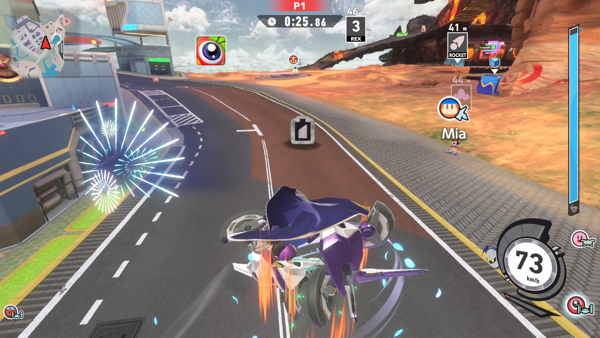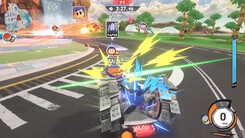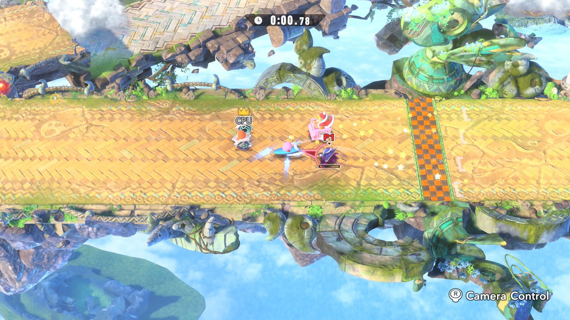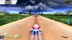 Az utolsó fő mód a City Trial, ahol egy relatíve nagyobb, szabad téren randalírozhatunk (alapértelmezetten) öt percen keresztül, miközben fejlesztjük járművünket: növelhetjük erejét, védelmét, gyorsaságát és egyéb paramétereit dobozok széttörésével, véletlenszerű kihívások teljesítésével és mások egrecíroztatásával, akár 15 másik játékossal. Ez elképesztően kaotikus tud lenni, bár ez a teljes játékra igaz. Ha letelt az időlimit, egy vokssal eldöntött minijáték következik, ahol kamatoztathatjuk masinánk alakított tudását. Ha például a repkedésre gyúrtunk, érdemes a célbarepülés felé terelni az eseményeket; ha az erőre, akkor a csaták felé. Lenyomhatunk a terepen elhelyezett gombokat pontokért; felzabálhatunk szétszórt kajákat; de versenyezhetünk is szimplán körbe-körbe. Nem győzöm hangsúlyozni, hogy ez milyen zűrzavarba tud torkollni, ahogy azt sem, hogy ez mennyire szórakoztató, főleg, ha hús-vér emberek rejlenek kajla kinézetű ellenfeleink mögött. Talán ez az, ami a legjobban szemlélteti a Kirby Air Riders szellemiségét: pillanatról pillanatra résen kell lenni. Vannak elemek, amik tanulhatók, gyakorolhatók, kiismerhetők, mint a karakterek, a járművek és a pályadizájn. A rengeteg, folyton generálódó szituációk miatt azonban a siker azon múlik, mennyire tudunk a másodperc töredéke alatt helyesen dönteni. Benéztünk egy kanyart és leestünk? Sebaj, ha épp ott egy olyan ellenség, akinek a reflexből benyelt képessége pont szuper jól jön. Hirtelen verseny tör ki a főtéren? Nyomás megnyerni, pont fel vagyunk rá szerelkezve, így pedig még több pontot szerezhetünk. Gyengén kerültünk egy csataarénába? Várjuk meg, amíg a többiek szétmarcangolják egymást, és marcangoljuk szét a szédelgő győzteseket!