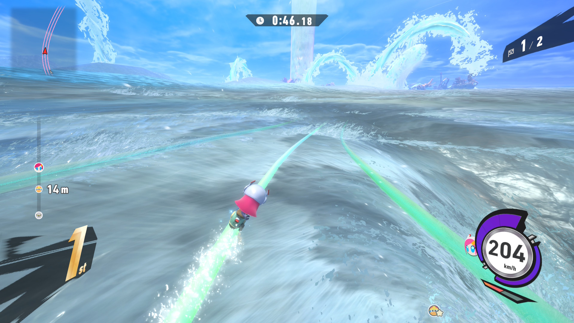 A játék ráadásul mind a többjátékos, mind az egyjátékos fronton remekel – és főleg ez utóbbi az, ami már alapvetően elhatárolja a Mario Kart World élményétől. A multiplayer nagyon vagány a maga őrületével, míg, ha egyedül veted bele magad, rengeteg dolog és tennivaló vár. Egy csomó karaktert és gépet, valamint a személyre szabhatósághoz elemeket lehet feloldani, a festésektől, mintáktól és matricáktól kezdve a díszekig. Tény azonban, hogy eszement jellege miatt nehéz lehet elkapni a lendületet, és kell hozzá némi türelem: főleg, ha egy hagyományosabb versenyzős élményre számítasz. Ráadásul az egygombos megközelítés lekorlátozza valamennyire a technikai mélységet, és néhány vezérlési megoldás kifejezetten zavaró lehet. Például van egy gép, aminél két funkció között lehet váltani a joystick jobbra-balra mozgatásával, viszont egy-egy gyors irányváltásnál is bekövetkezhet ez, hiába nem az volt a cél. Egyszerű kivitelezése így egyszerre áldás és átok, de így is lenyűgöző, mennyi mindent ki tudtak hozni belőle. A Kirby Air Riders ráadásul abszolút hű az eredeti részhez, és rengeteg elem onnan tér vissza, csak jóval kidolgozottabb formában, frappánsabb megoldásokkal és persze sokkal gyönyörűbb köntösben. Igazi kuriózum, telis-tele lélekkel, kreativitással és merészséggel, amit lehet majd imádni és utálni – és ettől tündökölhet igazán.