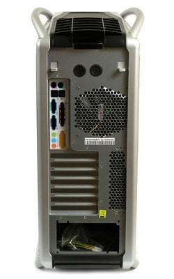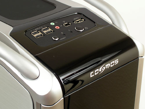 Szemből nézve tiszteletet parancsolóan oszlopszerű a Cosmos. Ne felejtsük el, hogy 60 cm magas! Hátul az első dolog ami szembetűnik, hogy a táp alul van. Az alaplap csatlakozói mellé hagyományosan 12 centiméteres ventilátor került, fölötte pedig két, vízhűtéses csöveknek való nyílás látszik. Legfelülre egy csavarral rögzített szellőzőrostélyt tettek.