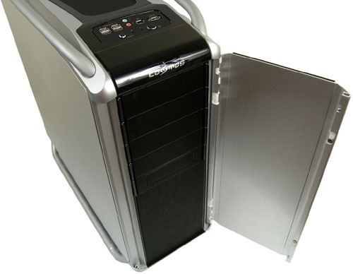 Régi stackereseknek némileg csalódást jelenthet, hogy a nagyméretű aluajtó mögött csak öt rácsos, 5,25 hüvelykes meghajtóhely van. A fedél nyitásának iránya pár mozdulattal megcserélhető, de nélküle is esztétikus marad a Cosmos. Ami érdekes, hogy zárt ajtóval a homlokzat felől egyáltalán nincs szellőzőnyílás.