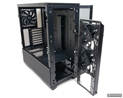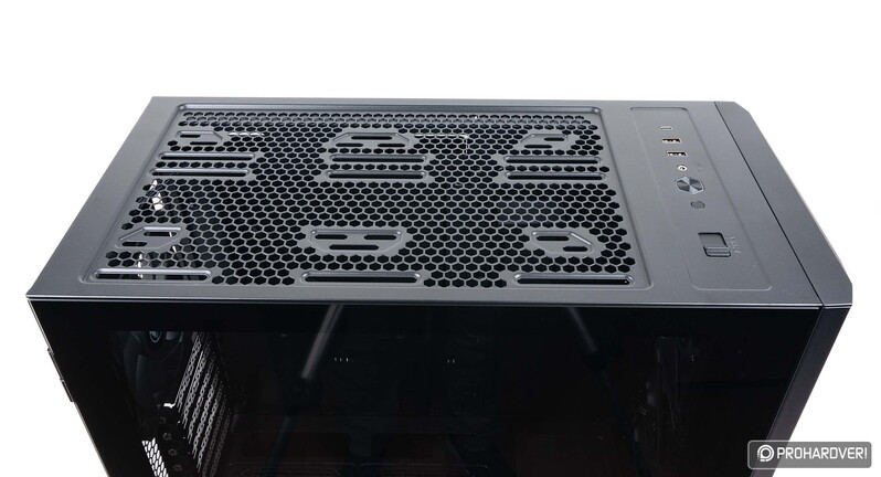 A 494 mm magas, 229 mm mély széles és 478 mm mély ház felső részén elöl a kezelőszerveket és a csatlakozókat találjuk: egy bekapcsoló és egy reset gomb (plusz pont, hogy erre is gondoltak), egy kombójack, két Type-A és egy Type-C konnektor, valamint a ventilátorvezérlő kapcsolója kapott itt helyet. Az utóbbi négy fokozatot kínál: alacsony, közepes és magas fordulatszám mellett lehetséges az alaplapi vezérésnek is átadni a terepet, ebben az esetben a mellékelt hattcsatornás hub a PWM jelet osztja szét a csatlakoztatott légkavarók felé. Az USB portok kapcsán is elégedettek lehetünk, mert a Type-A és Type-C konnektorok egyaránt az USB 3.1 szabványnak megfelelő bekötést kapták.
