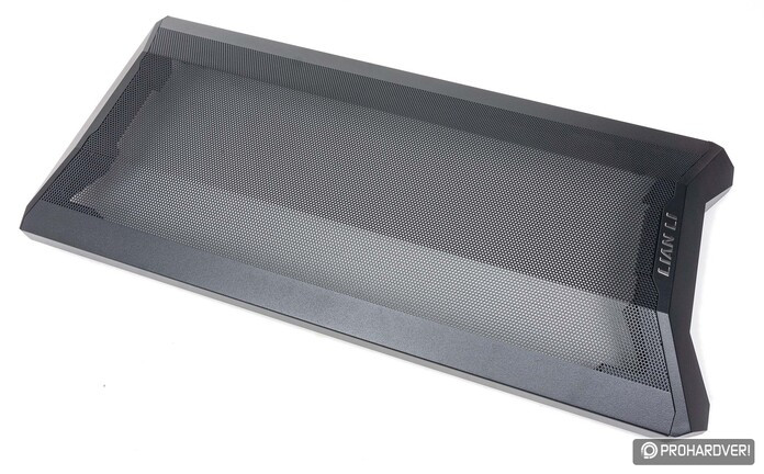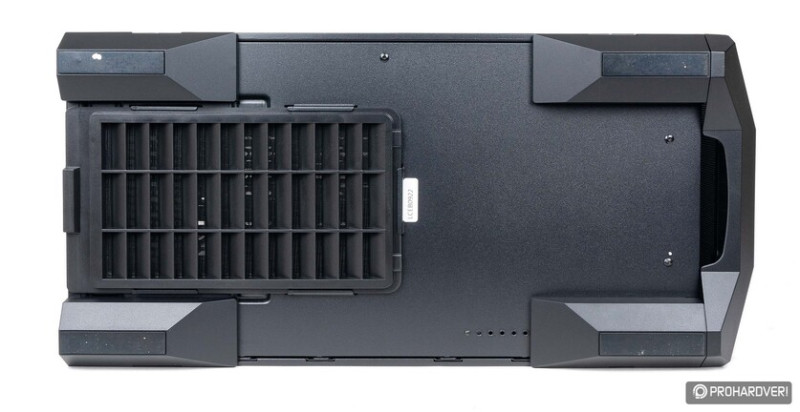 Fent hátrafelé haladva egy széles, az elvárásoknak megfelelően mágnesesen rögzített hálós betétet látunk, mely természetesen egy újabb szellőzős részt takar. Itt két 12 vagy 14 cm-es ventilátor helyezhető el, de egy 240 mm-es radiátor is elfér, hiszen a rögzítőpontokat a középvonalhoz képest annyival tolták el balra, hogy még a magasabb memóriamodulok és VRM hűtések sem lesznek útban.