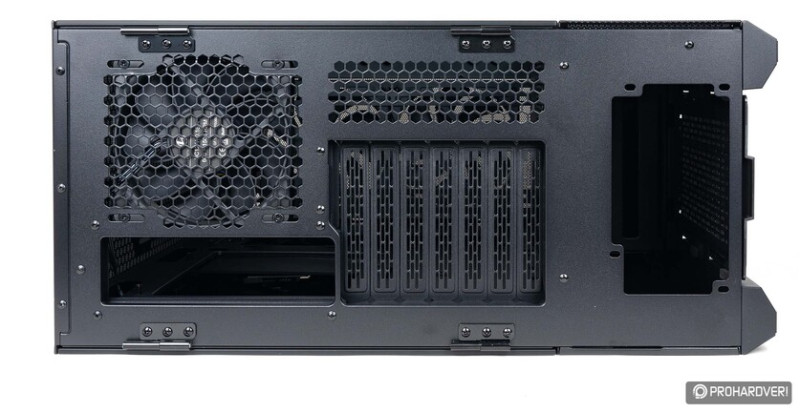 Áttérve a gép hátsó felére, itt kevesebb az érdekesség: a már említett 12 cm-es ventilátor mellett hét bővítőkártyahely sorakozik. Alul a széles lábakon túl egy hátrafelé kihúzható, így könnyen tisztítható szűrővel védett szellőzőnyílást láthatunk, mely a tápegység hűtésében jut szerephez.