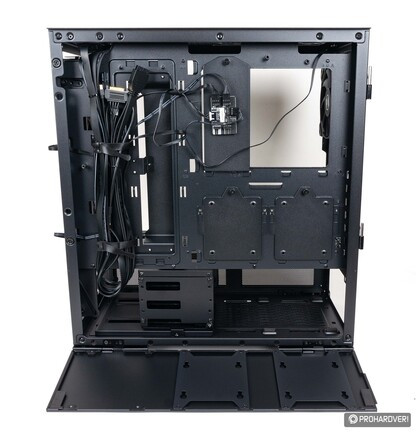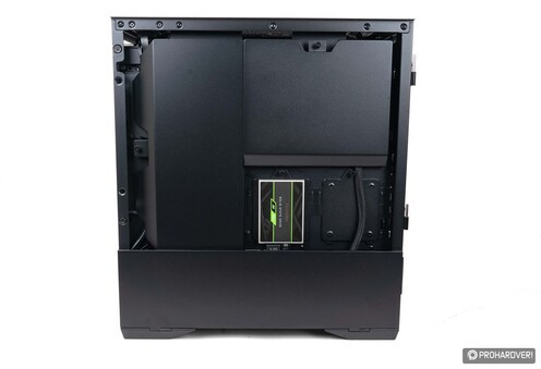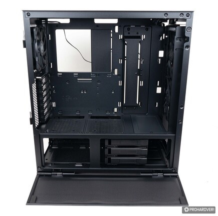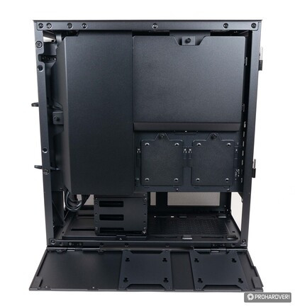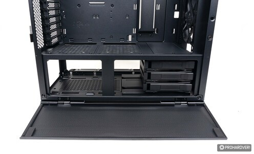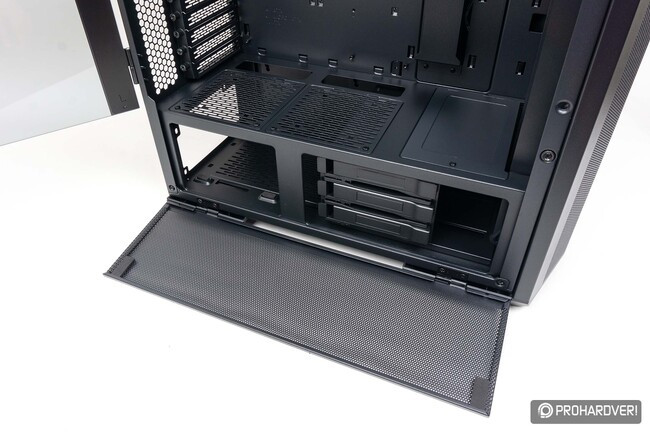 Az alsó- és felső területet elválasztó lemezen három „ajtót” találunk. Az első tömör, ez igazából csak egy takarólemez, melyet hármadik ventilátor vagy 360 mm-es radiátor használatakor le kell szerelni. A hátrébb lévő két másik ajtó szellőzőnyílásokat kapott, így több friss levegőhöz juthat a grafikus kártya. Ha ez nem lenne elég, akkor ezeket eltávolítva két 12 cm-es légkavarót is bevethetünk itt, míg ha inkább a tárkapacitást növelnénk, akkor két 2,5”-es SSD-t tudunk ezekre felerősíteni.