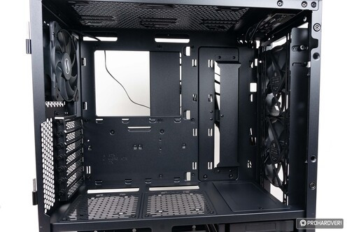 Tovább haladva a belső térben felfelé, az alaplapi tálcán sok érdekességet nem láthatunk, az előtte elhelyezett kábeltakaró azonban két irányban is beépíthető, így alkalmazkodik alaplapunk mélységéhez. Ugyanez az állíthatóság fedezhető fel elöl, ahol a ventilátorokat tartó keretet tudjuk kiemelni a házból.