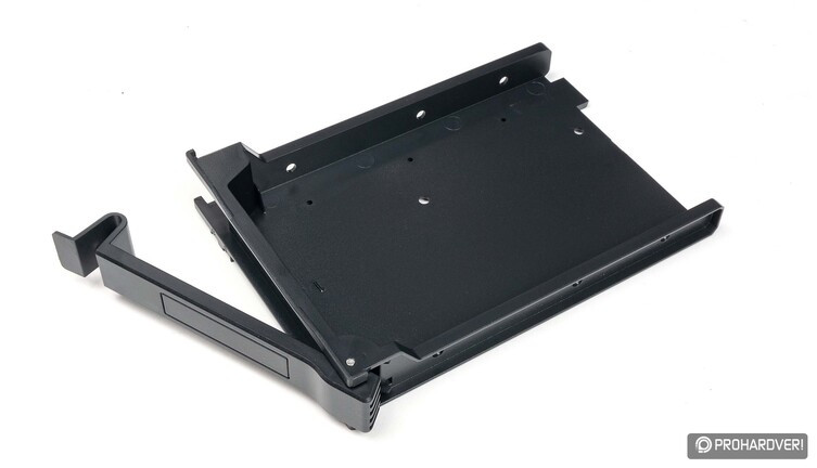 Ez a rész tehát egy hosszúkás kamra, melynek hátsó részébe a tápegység kerül, elöl pedig a 3 darab, kézzel kihúzható, műanyagból készült HDD-fiókot fogadó rekeszt találjuk. Ez a rekesz egy műanyag sínen ide-oda mozgatható (nincs végtelen állítási lehetőség, egy csavarral 9 „fokozatba” kapcsolható), így megtalálhatjuk az ideális pozíciót az előlapi hűtés és a tápkábelek helyigénye között. A műanyag fiókok 3,5”-es és 2,5”-es meghajtók fogadására egyaránt képesek, de az utóbbiak számára a jobb oldali alsó panelen is kialakítottak két rekeszt.