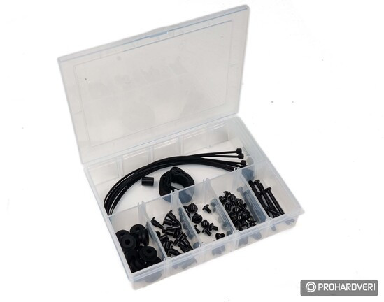 Az így kialakított kábelelrendezést a tálca hátoldalán található fülek segítségével fixáltuk – a Lian Li egy rekeszekre osztható, pofás kis dobozban mellékeli a csavarokat, és itt több kábelkötegelőt és tépőzáras rögzítőt is találunk a művelethez.
