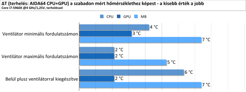 A ventilátorok kapcsán megemlítenénk viszont, hogy nem tartoznak a leghalkabb modellek közé, már a közepes fokozaton is tisztán hallhatóak, maximális fordulatszámon pedig kifejezetten hangosak. Ezért ha igazán halk gépet akarunk, inkább hagyjuk őket minimális fordulatszámon, vagy bízzuk a vezérlést a beépített kontroller helyett az alaplapra.