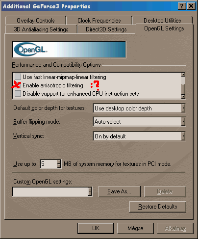 A 12.40-es NVIDIA driver az első olyan hivatalos holmi, amely már a Ge3-at is hozza a támogatott kártyák közt, sőt, ebből készíti az Elsa és az ASUS is a hivatalos meghajtóprogramjaikat. (ezt megelőzően csak beta driverek voltak foghatók, legutóbb még mi is a 12.00-ással teszteltünk) A 12.40-esben (sőt, hamarosan itt a 41-es beta is..) már elérhető pár olyan beállítás, amely korábban csak registry hackkel volt hozzáférhető, mint pl. a 64 mintás anisotropic filtering című textúra szűrés, amely azonban egyrészt csak OpenGL alatt pálya, másrészt, ugyan látszik a hatása, de sokkal inkább érződik: 640-ben, 0xAA mellett is élvezhetetlennek tűnt, rángatott.. (az, hogy ezt pl. a Quincunx-szal érdemes összehozni, nekem alapból meredeknek tűnik, de megfelelő élmények után, szívesen helyesbítek.. :)