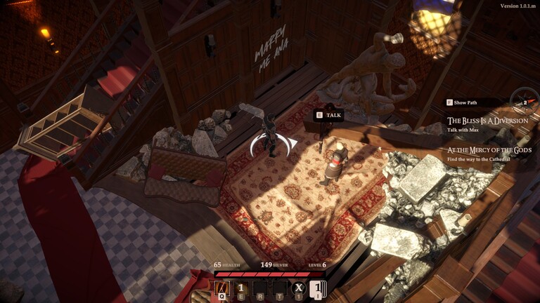 Én egyébként pont e furcsa kapcsolat miatt csaptam le a tesztelési lehetőségre: a francia forradalom és egy dimenzióutazó bizarr démon találkozása varázslatos alapötletnek tűnt. Rögvest a cikk elején el kell szontyolítanom azokat, akik hasonlóképpen gondolnák a dolgokat: a Lady Bliss névre hallgató entitás tulajdonképpen csak a játékbeli mechanikák magyarázatára szolgál, a forradalom pedig gyakorlatilag nem jelenik meg a játékban. Igaz, egyes helyszínek franciás nevet kaptak, és a trikolór színei is sokszor feltűnnek, de ezeken a látványelemeken túl szinte bárhol máshol is lehetnénk.
