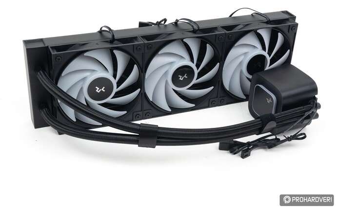 A DeepCool LE360 V2 elérhető a tesztelt feketében és fehérben is, és létezik egy dupla ventilátoros testvére is, mely az LE240 V2 névre hallgat és az LE520-at váltja. A dobozból gyakorlatilag teljesen összeszerelve emelhetjük ki a hűtőt: a ventilátorok a radiátoron, a hűtőpaszta pedig a blokk aljára applikálva várja a beépítést. Az utóbbi – na és persze a kedvező ár – azt jelenti, hogy plusz pasztát nem kapunk, amit mi sosem díjaztunk, filléres extra figyelmesség lenne a gyártó részéről. A spórolás tetten érhető a ventilátoroknál is, hiszen nem kapunk sorba köthetőséget, az ARGB és táp/PWM kábelek ott lógnak mindegyik oldalán, az ezekhez tartozó közösítőt pedig a szerelék között találjuk.