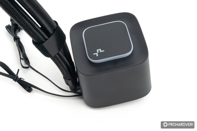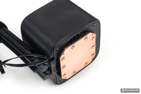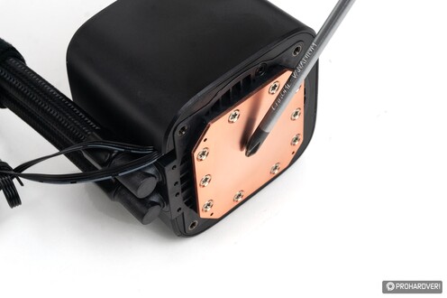 A csövek másik végén a hűtőblokk forgatható, 90 fokos csatlakozóit találjuk, melyek a hatodik generációs pumpához kötődnek. Ez a pumpa a korábbinál csendesebben, egyenletesebben jár (forgórésze hathornyos, négy pólusú), és, mint már említettük, nem fix fordulatszámú, hanem PWM jellel az alaplapról vezérelhető 2500-3400 rpm között. Ezzel az elődben használt, fix 2550 rpm-es motorhoz képest nagyobb térfogatáramot kínálhat.
