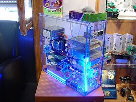 Egyre beljebb férkőztünk a hardverek dzsungelében, megcsodáltuk az igényes Antec házakat, a Sonata fényezését is szemügyre vettük, majd hirtelen egy nagy, átlátszó, kéken világító szörnyetegbe botlottunk. Egy hatalmas plexiház állt előttünk, ami drágasága és exkluzivitása ellenére sem nyerte el tetszésünket. A közönségdíjas caseMod tulajdonosának jutalma, a Minuet mATX ház viszont annál jobb benyomást tett ránk, hibátlan fényezésével és kompakt, egyszerű formájával. Amikor már azt hittük, mindent láttunk, amit az alsó szint tartogat, akkor akadtunk rá a hangérzékeny hidegkatód-csövekre, ami előtt mindenki tapsolva, vagy valamilyen hangot kiadva haladt el, némi derűt csempészve ezzel a komoly hardverek közé.