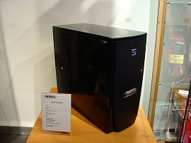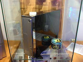 Inkognitóban közelítettük meg a galériát, hogy szükség esetén észrevétlenül távozhassunk. Körbenéztünk, és miután láttuk, hogy minden a legnagyobb rendben van, felfedtük kilétünket. A kiállítás kivitelezése nagyon korrekt volt, modern, letisztult vonalak fogadták be napjaink mondern hardvereit. A rengeteg ház-típus asztalokon várta a tapogatni vágyó kezeket, míg a zsebben jobban elférő elemek: ITX lapok, nV FX-ek és értékes társaik inkább vitrinekben lapultak, természetesen díszkivilágítva. Csak a kiállított termékekért is érdemes lett volna benézni, láthattuk egy Athlon 64 FX-es gépét, high-end Radeonokat, egy halom FX 5900-at, és hasonló mennyiségű alaplapot. A földszinten tovább bandukolva akadtunk rá a Gigabyte képviselőire, akik nyereményjátékra invitálták a vállalkozó kedvű (és hardverre éhes) látogatókat.