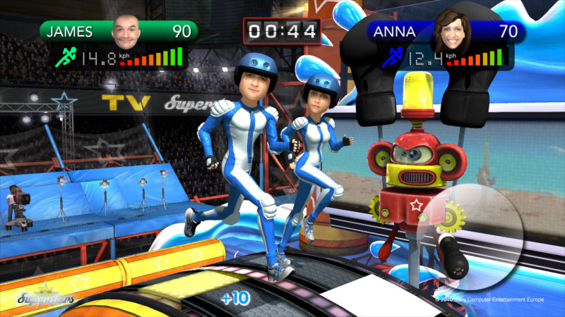 Ezzel azonban még nem fogyott ki a demólemez kínálata, van nekünk egy TV Superstars című játékunk is, ami első ránézésre nem érdemel különösebb említést, de mivel lehetőséget biztosít arra, hogy egymás kezébe adogatva az irányítót többen is játszunk, így érdemes vetni rá egy pillantást. Itt egy vetélkedőbe csöppenünk, ahol első körben egy divatbemutatón kell vonaglanunk, amit a Move controller adott vonalon történő mozgatásával tudunk kivitelezni. Az igazán érdekes rész viszont ezután következik. Ha túl vagyunk a párizsi kifutón, jön a már valóban vetélkedőre emlékeztető pálya, ahol egy méretes keréken kell körbefutnunk, miközben egy óriási majom próbál letaszítani róla, egy idő után kifejezetten fárasztó mutatványról van szó, de lazításképpen van még egy feladat. Itt egy csúzliból kell kilőni magunkat és a célba vett ablakon látható testhelyzetbe kell forgatnunk emberünket. Talán ez a játék mutatja meg leginkább, hogy mennyire jól követi kezünk mozdulatait a Move.