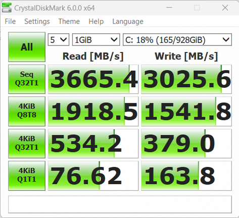 Először a háttértárat néztük meg, hogy minden rendben van-e ennek a komponensnek a háza táján. Egy Samsung PCIe 4.0 x4-es modellről van szó, és az SSD nem is teljesít rosszul, bár láttunk már magasabb adatátviteli sebességeket is tőle: