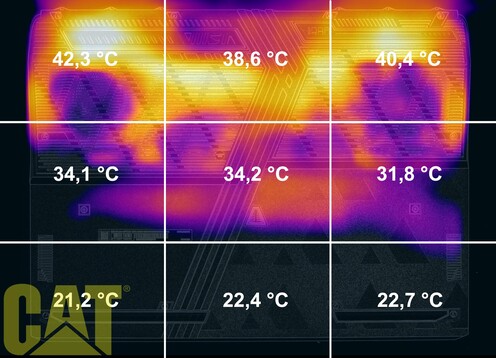 A magas belső hőfok egyébként a felső burkolaton kevésbé érződik, hiába, a vastag gépházban bőven van hely elvezetni a hőt. Alul már kevésbé „barátságos” a hőmérséklet, de a 3 kg-os gépet amúgy sem sokan akarják majd ölükben tartani.