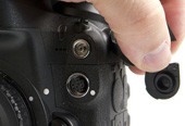 A Nikon – természetesen – a D4 optikai keresőjét sem hagyta beépített árnyékoló nélkül. Ha hosszú expozíciós időket használunk, érdemes használni ezt a két fémlapból álló reteszt, így elkerülhetjük, hogy hátulról beszűrődő fényszennyezés jusson el a szenzorhoz.