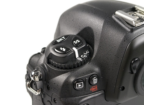Érdekes, hogy a mérnökök az elülső két funkciógombnál maradtak a régi dizájn mellett, nem hozták át a D800-nál látott, egymáshoz közelebb helyezett, s nagyobb felületű nyomógombokat, amelyek működtetése jóval kényelmesebb és természetesebb. A fotózásimód-választó tárcsa sem követi a D800 jóval kézreállóbb kialakítását. A tárcsa maradt a D3 érából megszokott változat annyi különbséggel, hogy egyes állásait immár érezhető kattanások határolják el egymástól. Hogy még egy kis plusz kavarodás is legyen a használatban, a multifunkciós szigetre más funkciók lettek elhelyezve, mint a D800-nál, ugyanis a D4-nél a vakumódok, a képsor (bracket) és a fénymérés módja található (D800: fehéregyensúly, ISO, képminőség és képsor, ráadásul másik gombra helyezve), tehát, aki mindkét gépet birtokolja majd, odafigyeléssel kell matatnia a kezelőfelületeken.