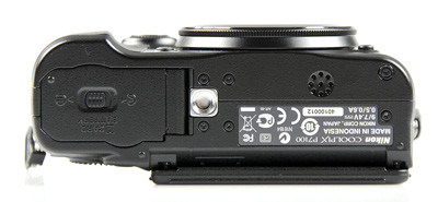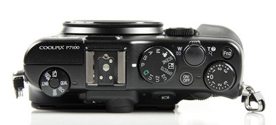A Coolpix P7100 tetőlemeze rendesen tele lett pakolva mindenféle jóval: a bal oldalon a gyorsmenü eléréséhez szükséges vezérlőtárcsa és nyomógomb kombinációja után a vakusaru, a módválasztó, majd a bekapcsoló és a kioldó (zoomgyűrűvel körbeölelve), a második funkciógomb és végül az expozíciókorrekció tárcsája látható.