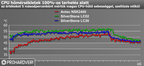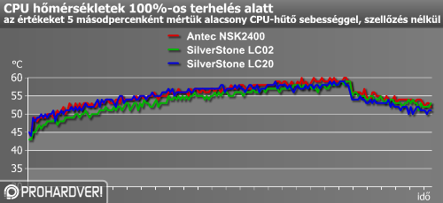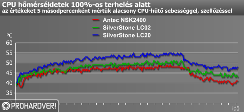A házak szellőzését visszakapcsolva és a processzor ventilátorát lelassítva is az Antec NSK2400-ban volt a leghidegebb a CPU, de 50 fok körüli eredményével a kisebbik SilverStone a nyakán loholt. Az LC20 55 fok alatti produkciója csak a harmadik helyre volt elegendő. A kis processzorhűtő a távoli, alacsony fordulatszámú ventilátor mellett nem tudta kellő hatékonysággal mozgatni a levegőt.