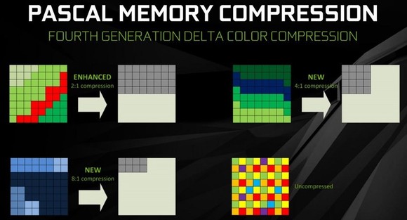 A Maxwellhez viszonyítva javult az NVIDIA saját Delta Color Compression technikája, amely még takarékosabban bánik a sávszélességgel. Ezt lényegében két új veszteségmentes tömörítési technika bevezetésével éri el, az eddigi egy mellé. Ez is teljesen megegyezik a GP104-nél látott megoldással.