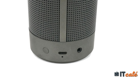 Az alsó káván helyezte el a gyártó a bekapcsológombot (hosszan kell nyomni), ettől jobbra került a micro USB kapu, amit csak töltéshez használhatunk, illetve a jack bemenet. A töltőcsatlakozó alatt a visszajelző LED furata található, ehhez nagyon hasonló a túloldalon a lyuk, ami mögé a mikrofont dugta a tervező.