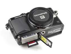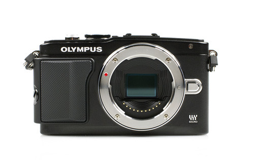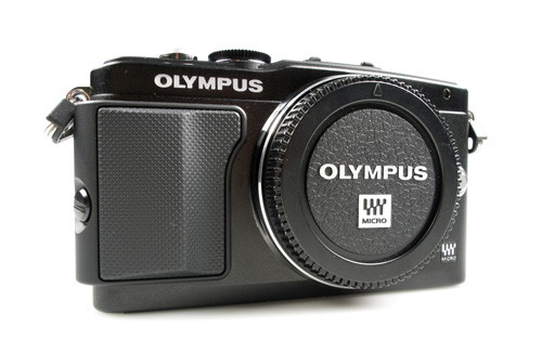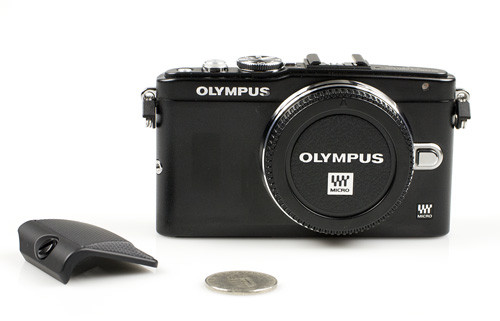 Az E-PL5 elejére – az E-P3 mintájára – egy leszerelhető és cserélhető markolat került, ami nagymértékben javítja a fényképezőgép ergonómiáját. AF segédfényt is kapunk, ez a váz elejének jobb felső sarkában látható.