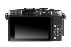 A hátoldalon már érdekesebb a kép, itt a mérnökök úgy oldották meg a gép méreteihez képest nagy kijelző mellett a nyomógombok elhelyezését, hogy a kevésbé fontosokat legfelülre, az érintésérzékeny panel fölé szerelték. Ennek következtében nem olyan kényelmes a lejátszás, a törlés, a kicsinyítés és a nagyítás kezelése. A fogás kényelmét egy hüvelyktámasz növeli valamelyest, az igazi kényelmi funkciót azonban maga az érintésérzékeny, le- és felhajtható kijelző jelenti. Az Olympus szokásához híven ezt is brutálisan erős és vaskos mechanika szolgálja ki.
