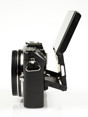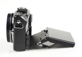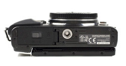 A géptest alján a fém állványmenet nincs teljesen az optikai középvonal alatt. Az akkumulátort és a memóriakártyát védő kis fedőlap nem rugós: ha a reteszt elhúzzuk, nem pattan ki az ajtó, hanem élettelen végtaghoz hasonlóan lifeg.