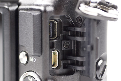 Hátulról nézve a készülék jobb oldalában található az USB és a HDMI aljzat egy aprócska műanyag ajtó mögé rejtve. Se mikrofon, se fejhallgató csatlakozóval nem rendelkezik a masina, de ez ebben a kategóriában nem is várható el.