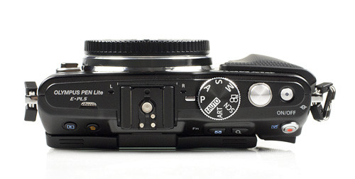 A váztest tetőlemeze zsúfolt hatást kelt, ami nem véletlen: balról jobbra haladva láthatjuk a készülék hangszórójának rácsát, a vakusaru mellett kétoldalt a sztereó mikrofon nyílásait, a módválasztó tárcsát, a kioldót és a bekapcsológombot. Így felülnézetből látható csak igazán, mennyire vaskos a kis jószág, mindazonáltal szélessége és magassága igen elenyésző; az E-PL5 igazi zsebgép, amit alábbi fotónk is szemléltet: